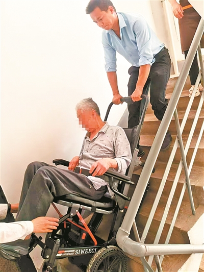 医院工作人员利用爬楼机带行动不便的老人下楼散心