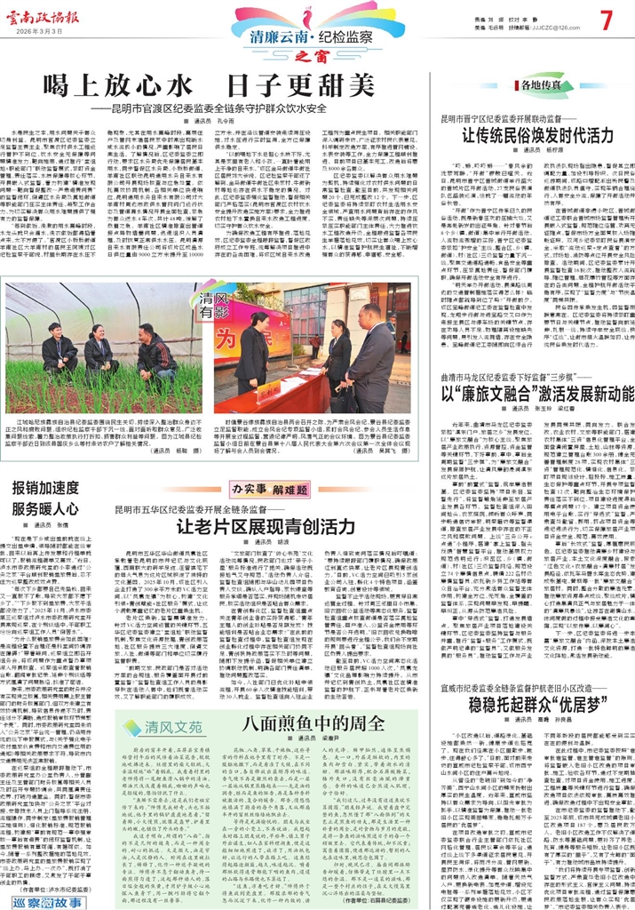 - 喝上放心水 日子更甜美 ■ 通讯员 孔令雨 水是民生之本,用水问题关乎群众切身利益。昆明市官渡区纪委监委立足监督主责主业,聚焦农村供水工程运行管护不到位、饮水安全无保障等问题精准发力、靶向施策,通过推行“室组地+职能